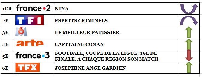 France 2 se hisse en tête. Le final de la saison 4 inédite de NINA réalise un bon score avec 3 074 000 téléspectateurs soit 15,3% du public (moyenne des 2 épisodes). La série française est en très légère hausse sur une semaine.