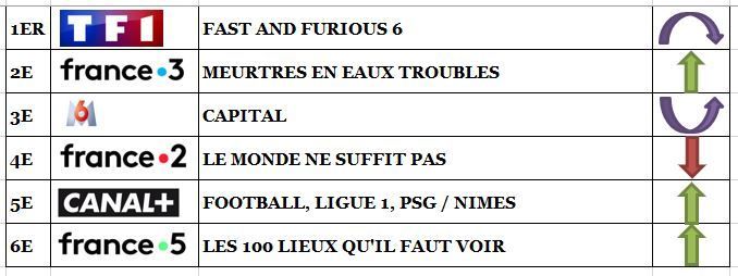 En résumé, TF1 déçoit, France 3, Canal +, France 5 et Arte cartonnent, M6 réalise un score correct, France 2 est faible, TFX domine la TNT.