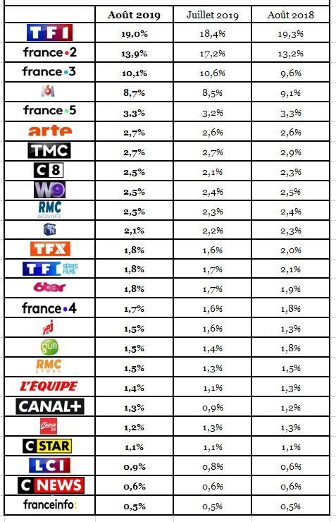 France Télévisions se hisse largement en tête des audiences en août 2019 avec 29,5% de part de marché. Suivent les groupes TF1 (26,2%), M6 (13,0%), Next Radio Tv (6,1%), Canal (5,5%) et NRJ (2,7%). France Télévisions bondit sur un an (+1,1 point) alors que les groupes TF1, M6, Next radio Tv et Canal + reculent. Le groupe NRJ est en légère hausse.