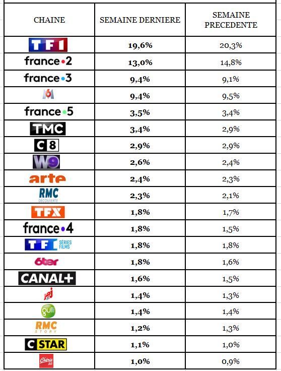 TF1 (-0,7 pt) et France 2 (-1,8 pt) chutent et déçoivent se contentant respectivement 19,6% et 13,0% de part d’audience. A égalité (9,4% du public), France 3 et M6 réalisent des scores hebdomadaires presque corrects. France 5 et Arte progressent. Canal + reste faible.