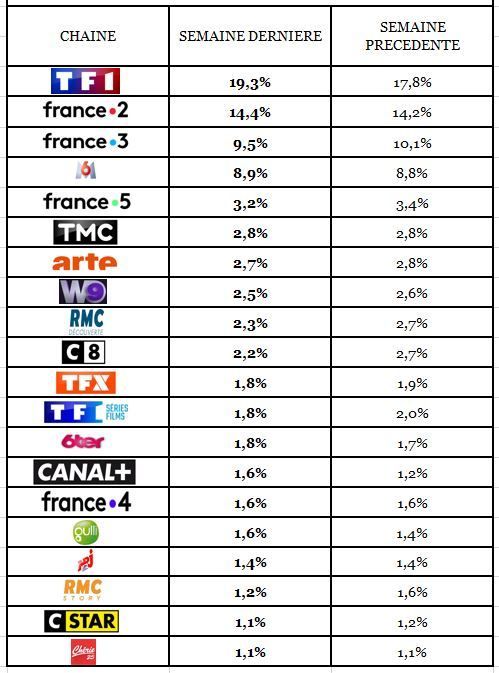 TF1 remonte (+1,5 point) mais se contente de 19,3% du public. France 2 est toujours très en forme avec 14,4% de pda. France 3 baisse (-0,6 pt) tout en passant encore une semaine satisfaisante à 9,5% de pdm. M6 reste faible (8,9% du public).