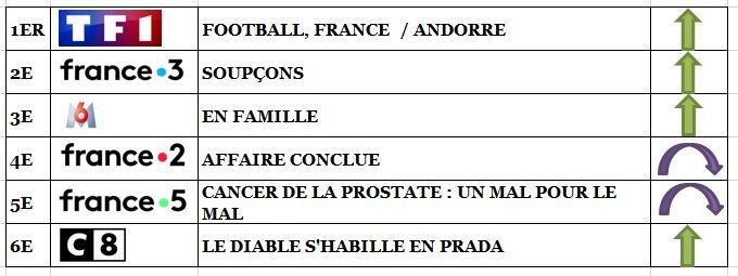 TF1 se classe en tête avec du FOOTBALL. 5 400 000 supporters soit 24,4% du public ont assisté au match FRANCE / ANDORRE.