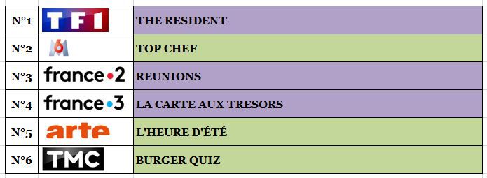 N°1 / TF1 se classe en tête à un niveau moyen. Le lancement de la série américaine THE RESIDENT a fédéré 4 440 000 téléspectateurs soit 18,6% du public, 27,5% des 25/49 ans et 31,8% des femmes de moins de 50 ans (moyenne des 3 épisodes).