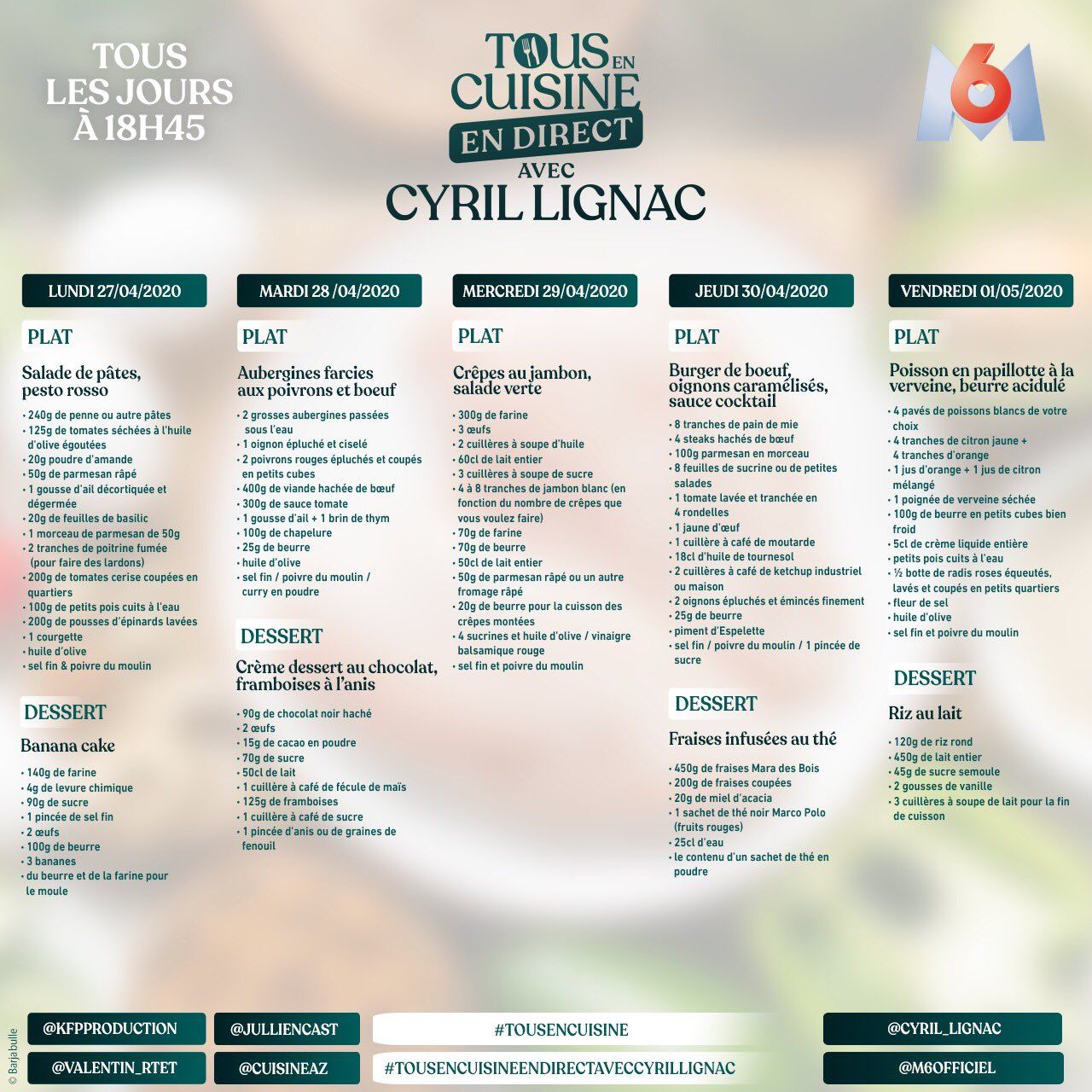 Les recettes de la semaine du 27/04 au 01/05/20